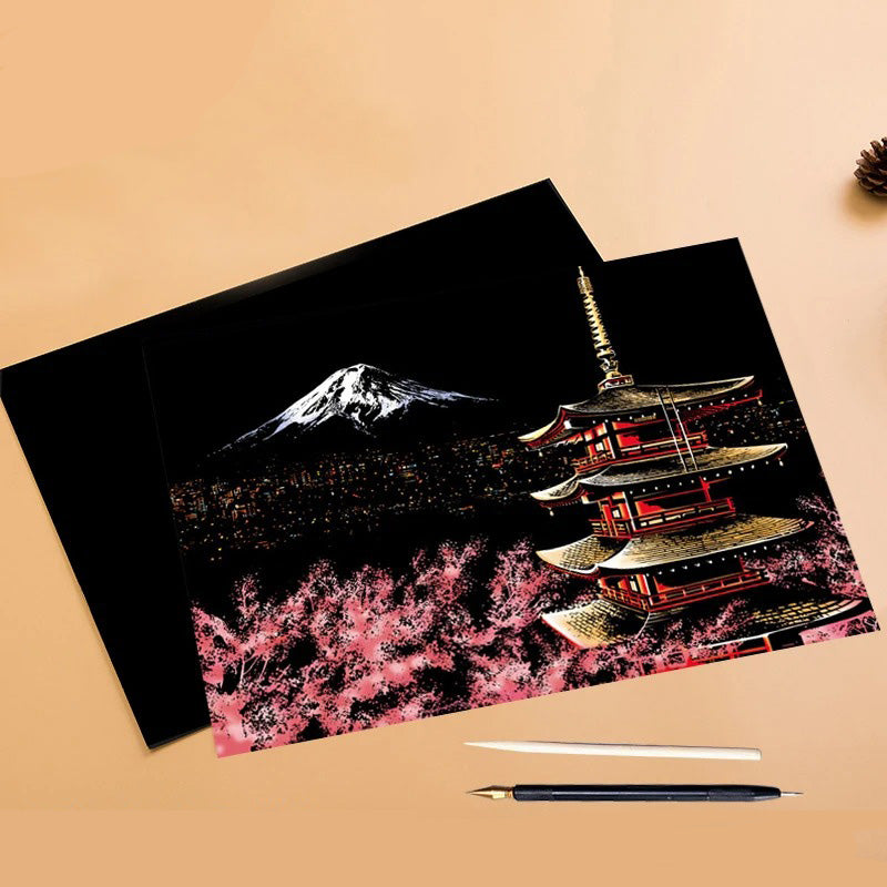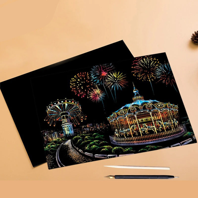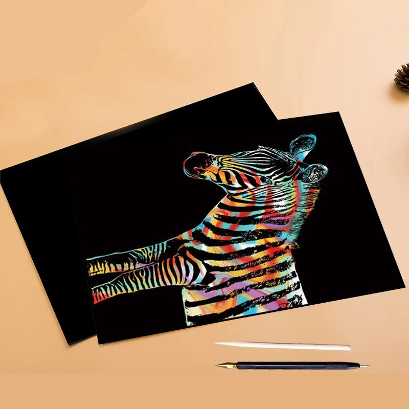 Grâce au stylet en bois et aux outils inclus, chaque coup de grattage laisse apparaître des couleurs vibrantes et inattendues.